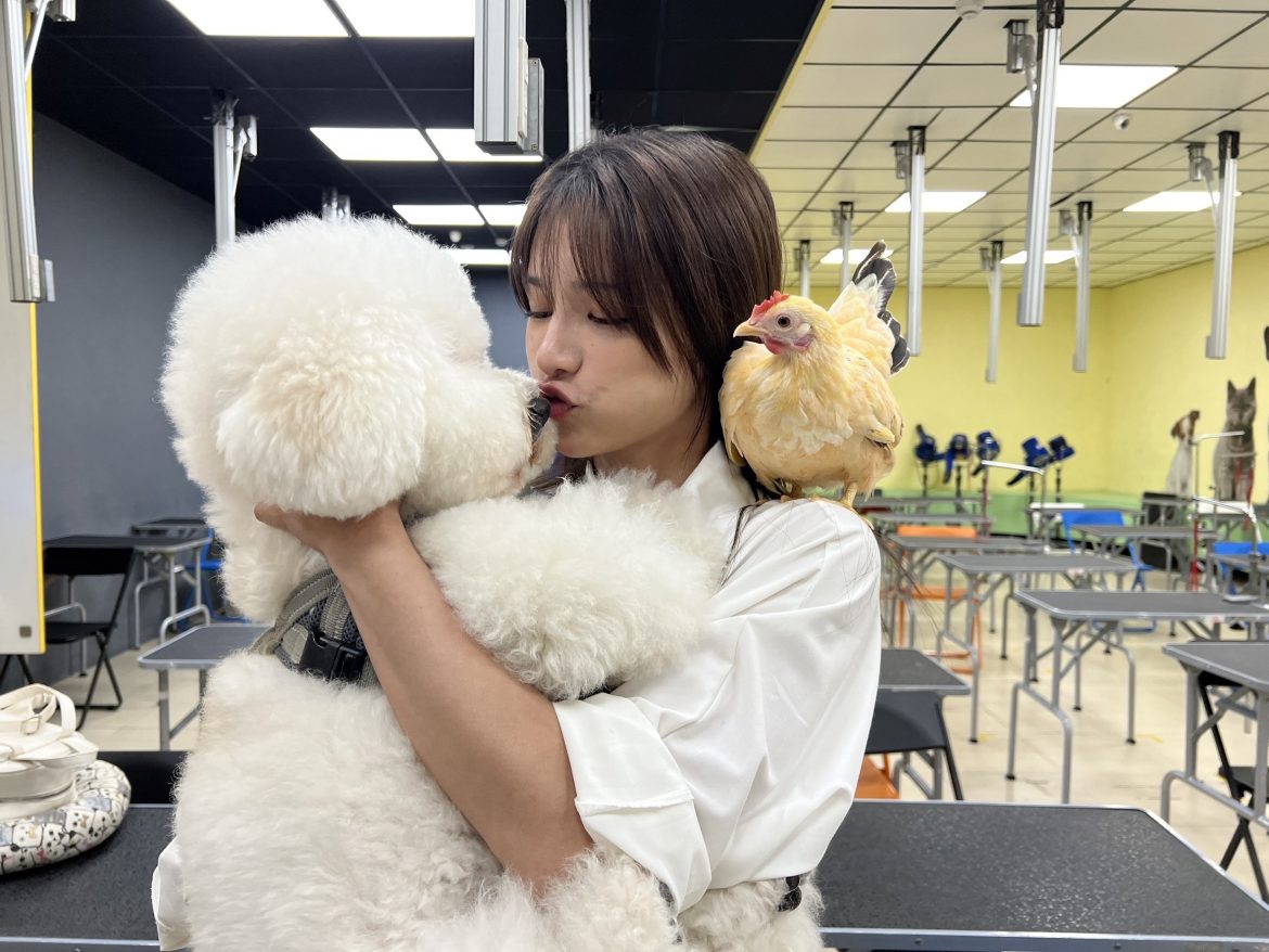 林岱縈看到同學們手上都抱著自己的寵物上課,忍不住一一把玩,還把小兔子放到頭上和一群比熊、吉娃娃、貴賓、貓咪一起擺拍,果然是天生藝人,一下女王、一下可愛甜美,讓同學也拿起手機狂拍,還不斷送上自己的萌寵,請岱縈一起跟合照,有夠熱鬧。