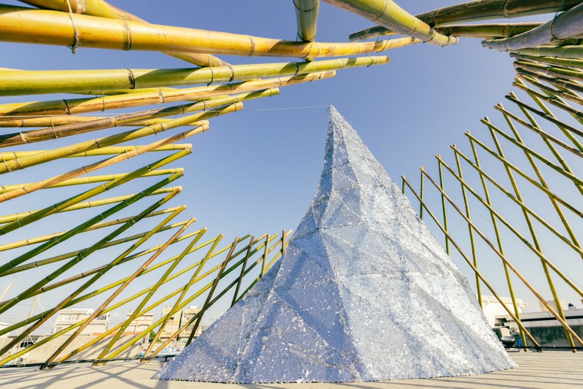 在擁有百年歷史的麻豆總爺糖廠遺址,林舜龍老師的作品《孕》以竹子編構出一顆高達4米的扁球體,象徵生命的孕育與成長。作品以層次豐富的結構呈現,外型猶如一顆卵,寓意著生命力的迸發與自然的和諧。日間時光,日光從裝置的孔隙間灑入內部空間,形成一種神聖的時間流動感,讓人彷彿置身於自然母體之中;而夜晚,燈光照射在竹製結構上,浪漫又詩意地表現出一種沉靜的生命之力。此作品不僅延續了臺南糖業發展的歷史記憶,更在空間中描繪出大地生養的永續之美。