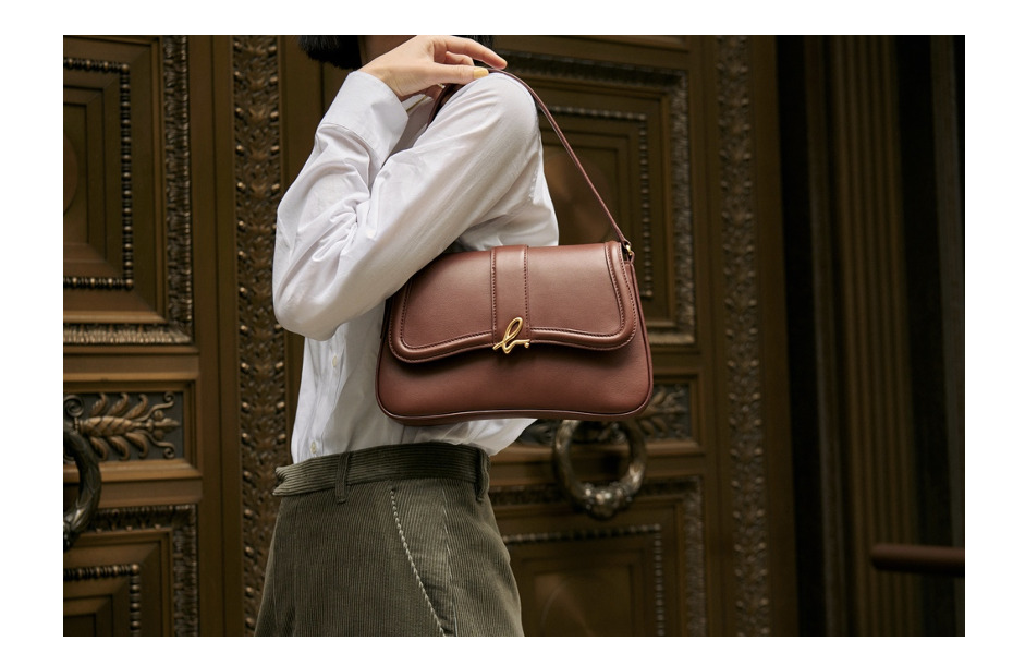 本季全新推出的囊袋式皮革肩背包,以質感柔軟的收縮壓花皮革打造出無縫結構,包身刻意減少金屬元素,線條純粹流暢,呈現極簡而優雅的視覺感受。外層與內裡選用雙面皮革製成,不僅強化整體一致性,更賦予輕盈自在的質感。開口採用獨特的覆蓋式設計,僅於提把處畫龍點睛點綴上金色扣環,展現柔和不失個性的都會氣息。