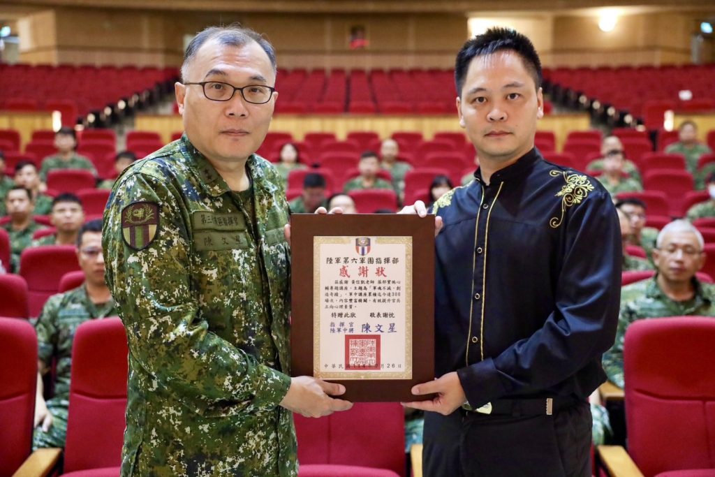 魔術師黃信凱以「軍魂不滅,創造奇蹟」為題,赴陸軍第六軍團獲指揮官陳文星頒贈感謝狀。(圖/黃信凱提供)
