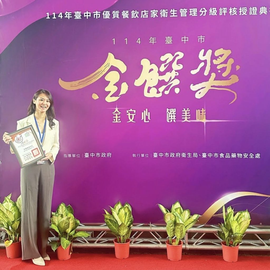 焦糖楓榮獲臺中餐飲食安界「食安奧斯卡」美譽的「金饌獎」優級殊榮,由焦糖楓執行長陳妍霖蒞臨領獎。(資料來源:焦糖楓)