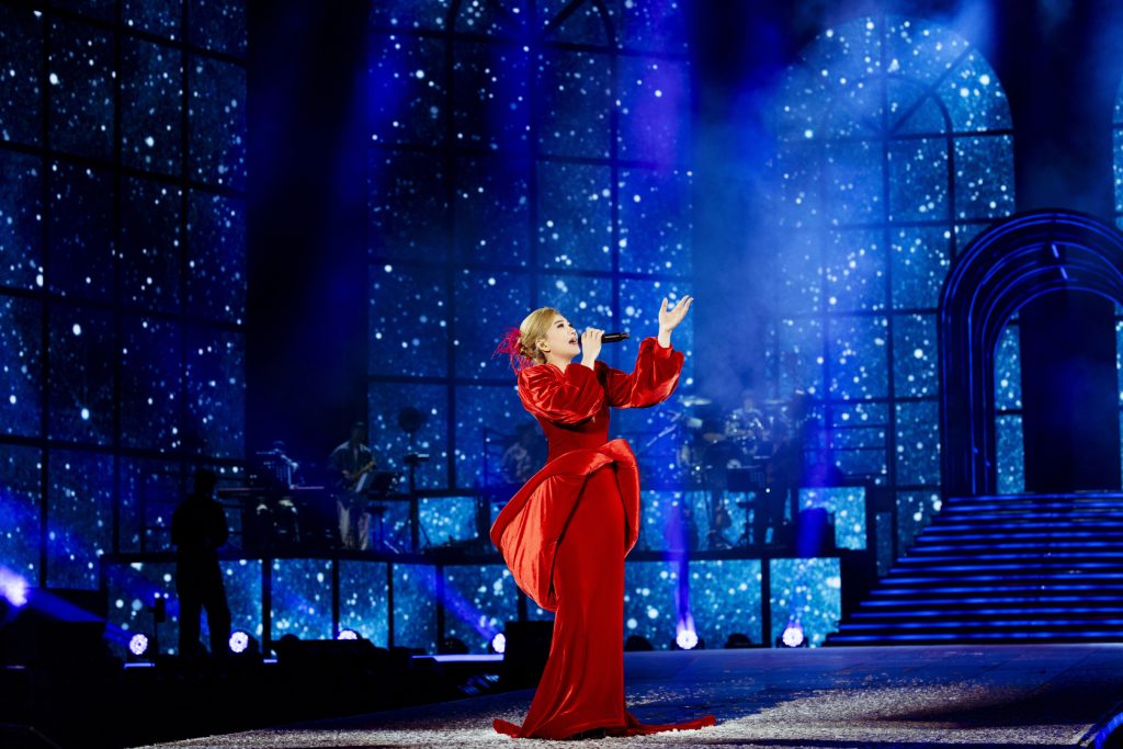 身為華語樂壇重要情歌代表,梁靜茹也在新巡演中提出「茹果我不唱情歌」的概念,以自我提問為起點,重新定義「情歌天后」的舞台可能性。演出開場以大螢幕字幕「怎麼又是情歌?唱情歌的勇氣」引人入勝,她身穿紅色天鵝絨斗篷晚禮服,以〈勇氣〉作為整場演出的核心動線。之後脫下斗篷、換上金黃后冠髮色,並以全新編曲演唱〈無條件為你〉、〈愛久見人心〉等作品,揭開第一組曲篇章。演唱〈天燈〉時,巨型LED投影萬千天燈飄向夜空,成為當晚視覺亮點之一。