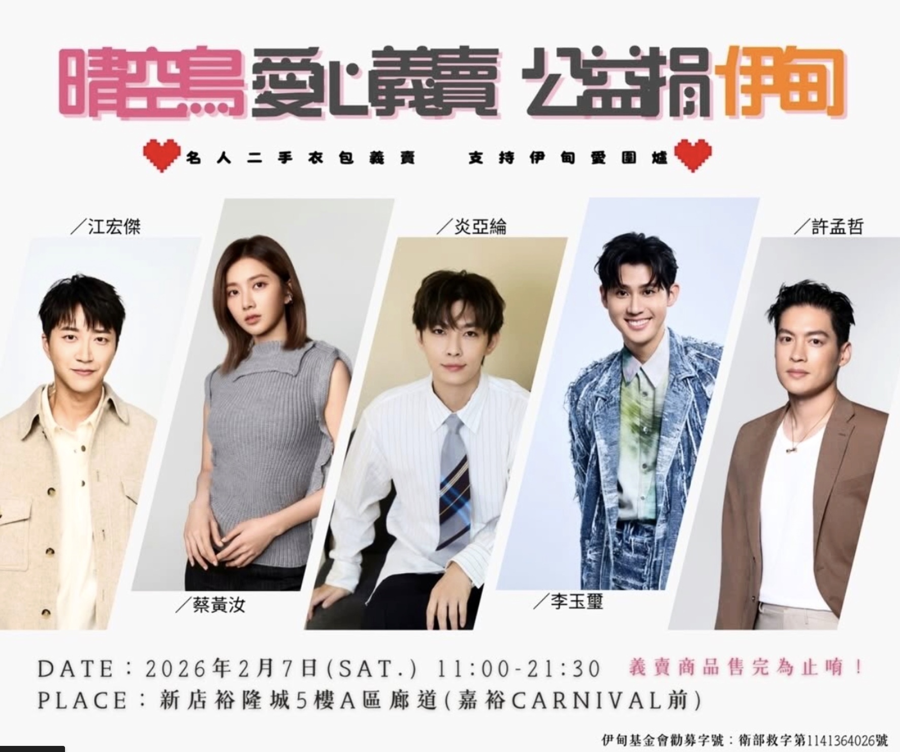 為支持伊甸基金會「愛・圍爐」服務,陪伴更多有需要的長輩與障礙者在農曆年前吃得暖心更暖,晴空鳥經紀公司負責人炎亞綸拋磚引玉,號召旗下藝人李玉璽、許孟哲、蔡黃汝以及江宏傑,共同捐出私服與配件,將於2月7日在新店裕隆城5樓舉辦愛心義賣,義賣所得將全數捐予伊甸基金會。活動自上午11點開賣,炎亞綸與李玉璽也將於下午1點親自現身義賣現場,與粉絲近距離互動,號召更多人一同支持公益。談及發起初衷,炎亞綸表示,隨著身分從藝人跨界成為公司經營者,肩上的責任也更加明確,不只是帶領團隊向前,更希望能為社會多盡一份心力。身為公司負責人,他帶領晴空鳥旗下藝人共同參與,將公益與關懷落實在日常行動中,也期待透過實際行動,邀請更多人一同加入送暖行列。他也提到,許多為表演或節目準備的服裝其實只穿過一、兩次,與其閒置,不如轉化為公益資源,讓衣物找到新的價值,並將收入化為實際的公益力量。