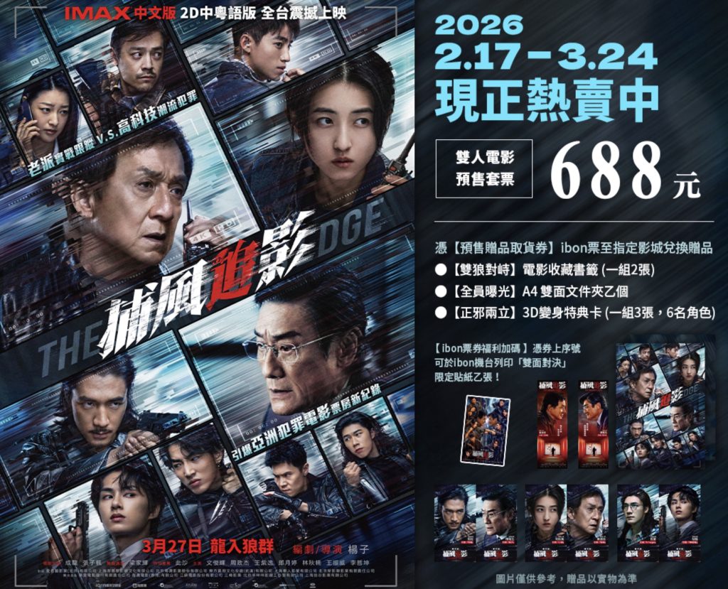 除了視覺驚喜,《捕風追影》也帶來購票新選擇。電影超值雙人預售票將於 2 月 17 日(大年初一)在 ibon 火熱開賣,全台 7-11 門市皆可購買,售價 688 元,即可享有雙人電影票與多款限定特典。預售套票內容誠意滿滿,包含「全員曝光」定檔海報 L 夾一張、「雙狼對峙」電影書籤卡一組(2 張)、「全員曝光」A4 海報 L 夾一個與3D 變身特典卡一組(3 款)。