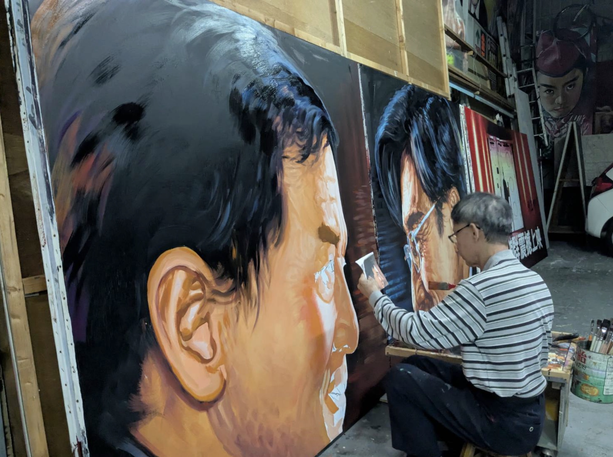 台南全美戲院手繪電影看板畫師 張玉村, 親筆繪製《捕風追影》「雙狼對峙」手繪看板(全美戲院提供)