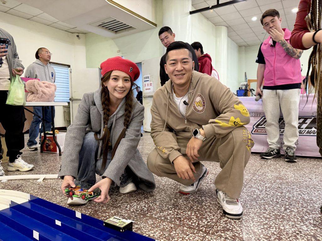 (由左至右)女神解婕翎也前來參加草爺舉辦「神行盃」活動,體驗「四驅車+ 鑽轎底」的競速祈福。(紅心字會 提供)