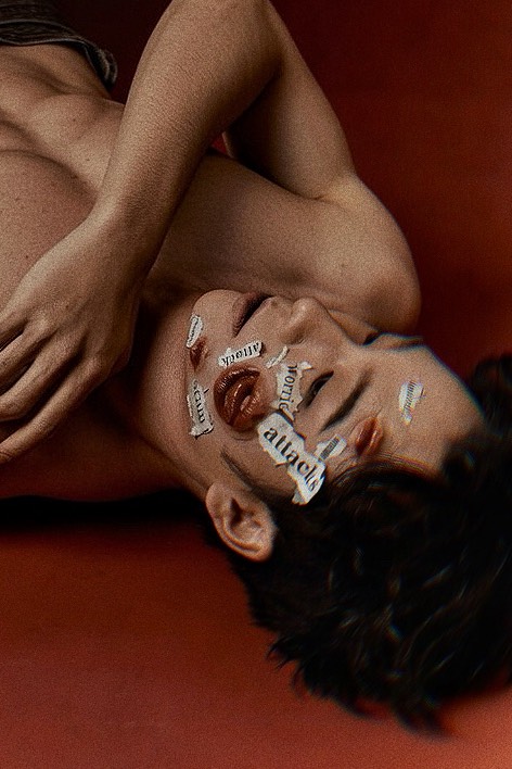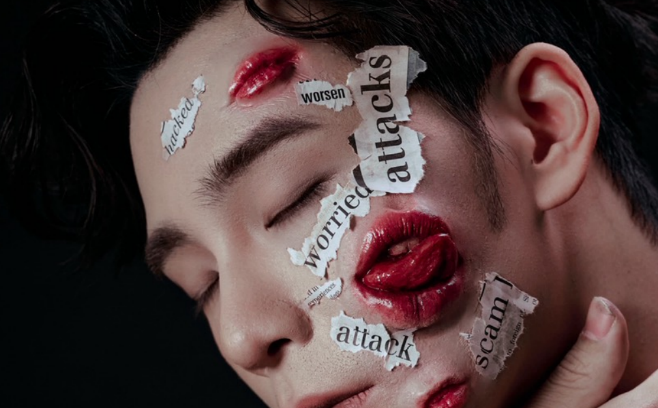 這組照片中,儲旭原本清秀的臉龐被特效技術改造,長出了數個鮮紅且扭曲的嘴唇。特別的是,身旁貼著的「hacked(被駭)」、「worried(擔憂)」、「attack(攻擊)」等碎紙片,並非隨機列印,而是儲旭從拍攝當日的報章雜誌上直接剪下。這些充滿負能量的字眼,具象化了當下社會的集體負面情緒,讓這件作品成為反映當代焦慮的「行動藝術」。
